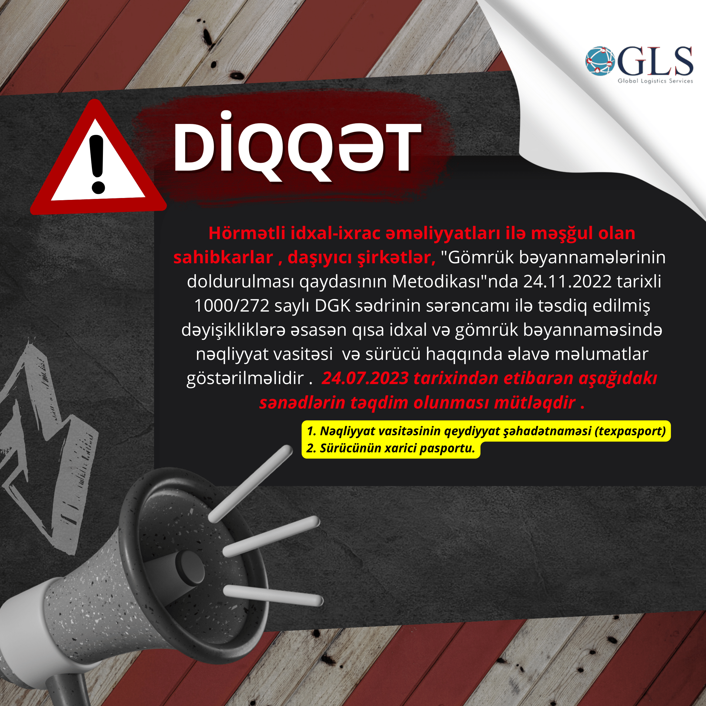 According to the decision of the Chairman of the State Customs Committee numbered 100/143 dated October 31, 2014, approved by the decision of the Chairman of the State Customs Committee numbered 1000/272 dated November 24, 2022, based on the amendments, additional information about the transportation vehicle and the driver must be provided in the short-term import and customs declaration. From July 24, 2023, it is mandatory to submit this information.To comply with these requirements, please provide us with the following documents: